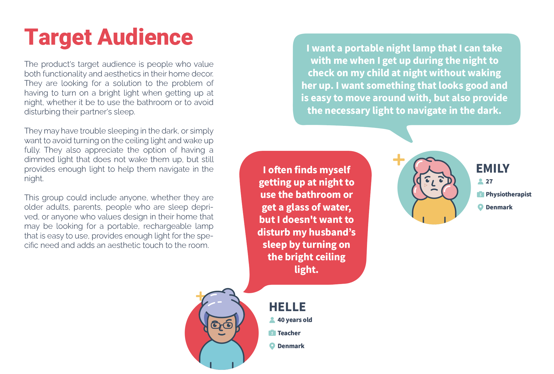 The purpose of this design project was to create a portable night lamp that met the needs of users who wanted a little extra light during the night, whether they were reading in bed or making their way to the bathroom. The lamp was meant to be practical and easy to use, and to function in a variety of settings, both in bed and on the go.