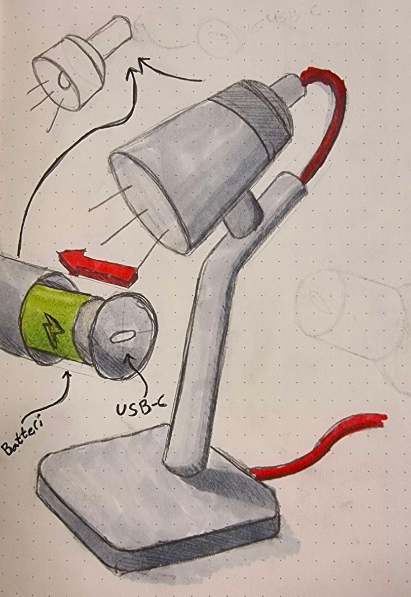 The lampshade should be designed to be detachable and function as a flashlight. The lampshade/flashlight should charge wirelessly on the stand via magnets, ensuring it's always charged and ready for use. This feature makes it easy and convenient for the user to put on and take off at night.