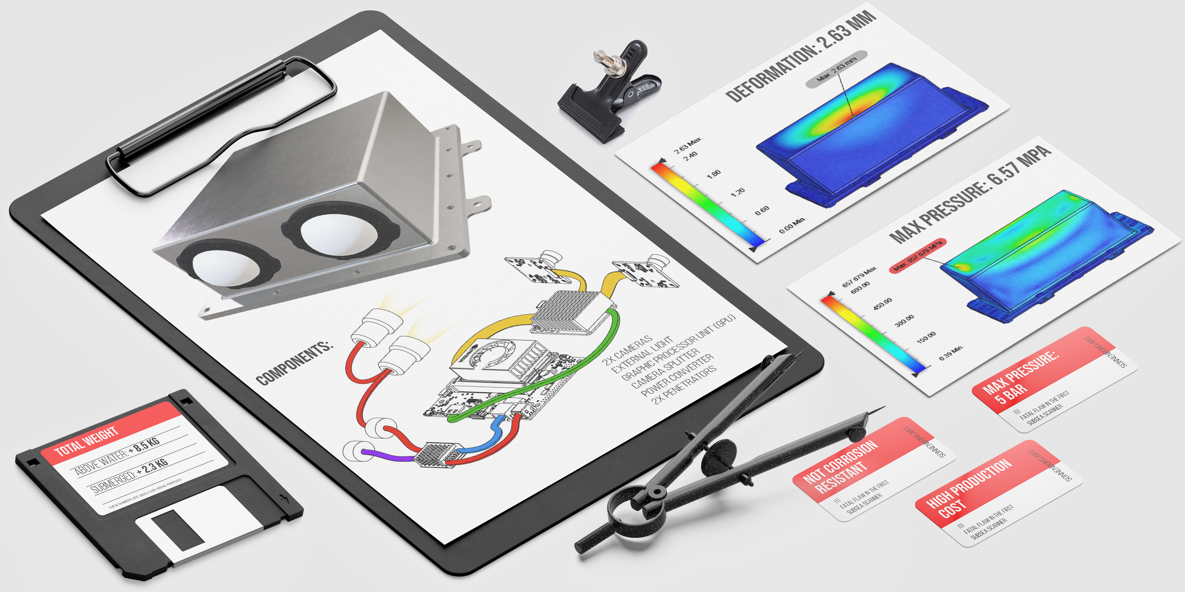 This project aims to design a waterproof housing for an advanced 3D scanner, used to inspect underwater structures. Traditional methods, like diving and video capture, often struggle with poor visibility. In contrast, precise 3D scanning's makes for more accurate inspections. This project aims to develop a compact, pressure-resistant enclosure for depths up to 300 meters, improving the scanner's durability, assembly and production cost.